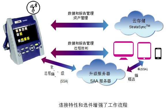 多個連接選件(通過USB和可選的藍牙/WiFi進行3G/4G智能手機連接)可實現(xiàn)遠程控制,并可與平板電腦、智能手機和計算機來往傳輸數(shù)據(jù)及工作指令。SmartOTDR可實時快速解決現(xiàn)場問題,可選的SmartAccess Anywhere(SAA)可在云中開辟一條隧道,使技術(shù)人員能夠遠程訪問和操作儀器。SmartOTDR與各種各樣的云服務(wù)器(WebDAV服務(wù)提供商)兼容,還可使用自帶的FastReport.pdf報告生成功能即時共享測量報告。